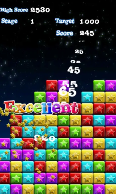 2、消除方法。颜色相同并连在一起的星星,可点击消除,消除的方块越多分值越高,