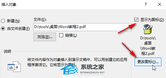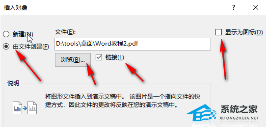 第四步:在打开的窗口中选择“由文件创建”,然后点击“浏览”按钮打开需要链接的文件,如果有需要可以点击勾选“链接”,“显示为图标”;