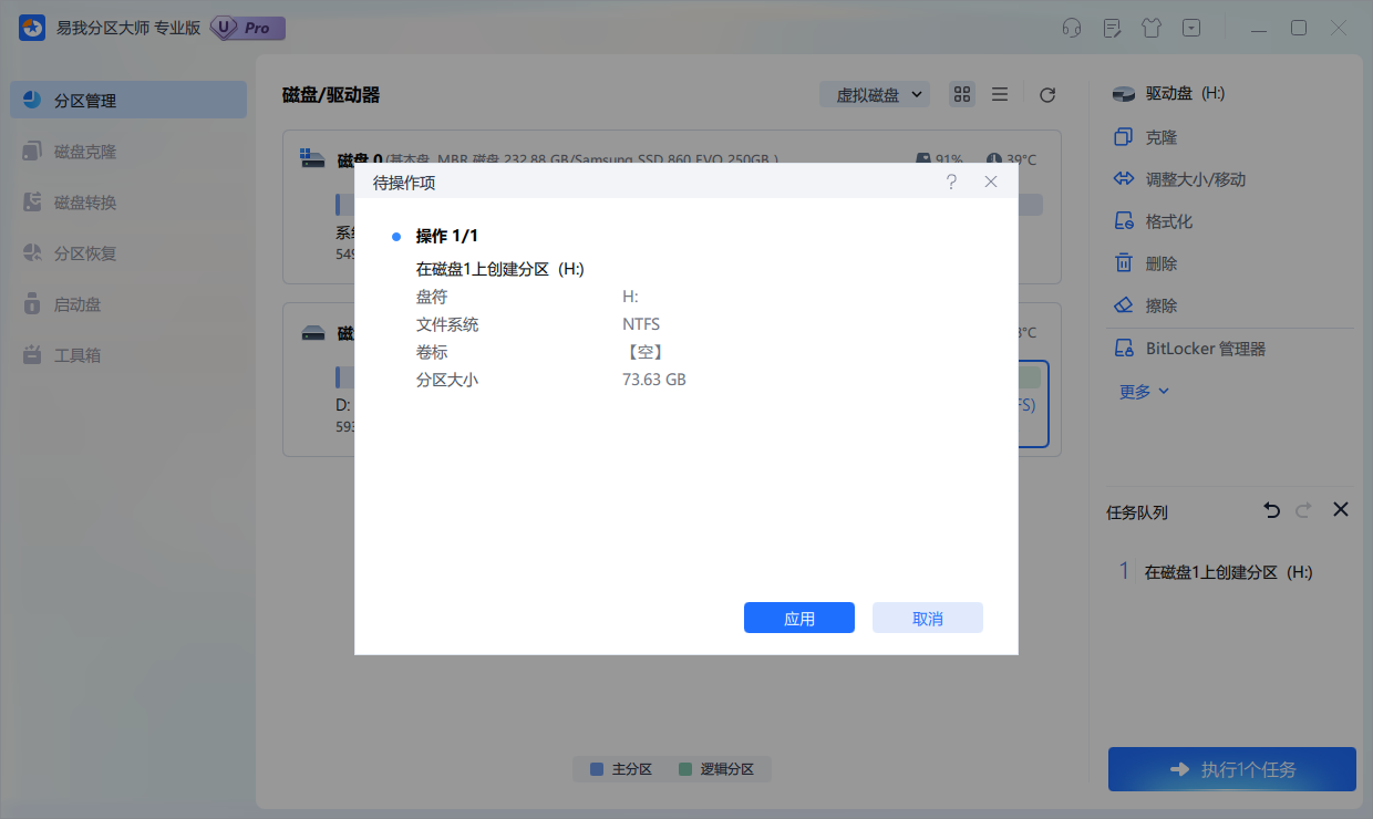 步骤4. 在返回的页面点击右下角【执行1个任务】,如果需要撤销可在“任务队列”进行,随后在弹出的窗口点击【应用】,开始执行操作。