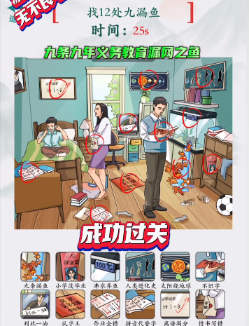 在下为大家带来疯狂梗传九漏鱼通关攻略,这一关需要玩家找到12处九漏鱼,九漏鱼指代的是九年义务教育漏网之鱼,也就是找到体现了文盲的地方就行了,下面是本关的答案一览。