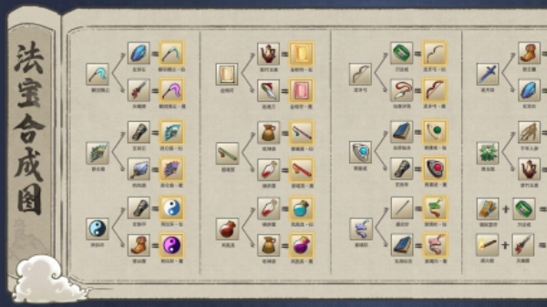 武器在升满级之后可以触发武器进化,法宝分为仙和魔两种,但是要用到的材料也是非常的难找的,各位可以先根据自己现有的材料去合成,后期找到了其他的材料才合成。