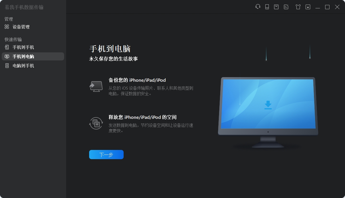 步骤2. 启动易我手机数据传输(EaseUS MobiMover)并找到「手机到电脑」模式。点击「下一步」继续。