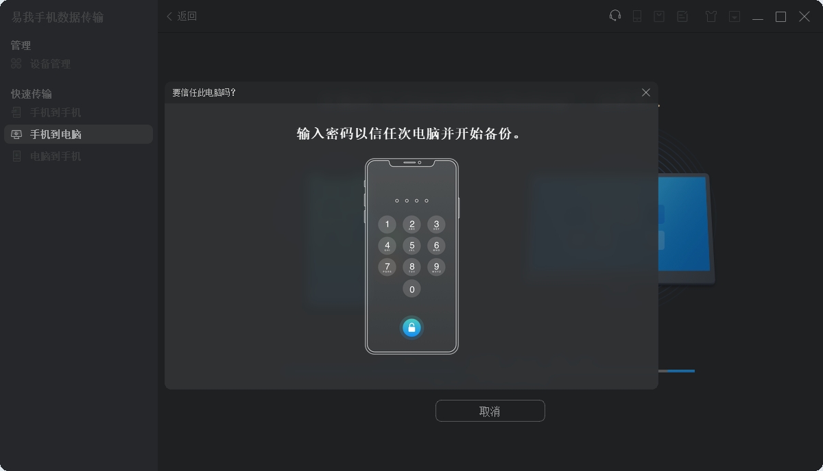步骤3. 选择您想传输的文件类型,选择好之后,点击「传输」,再输入密码以信任此电脑并开始备份。