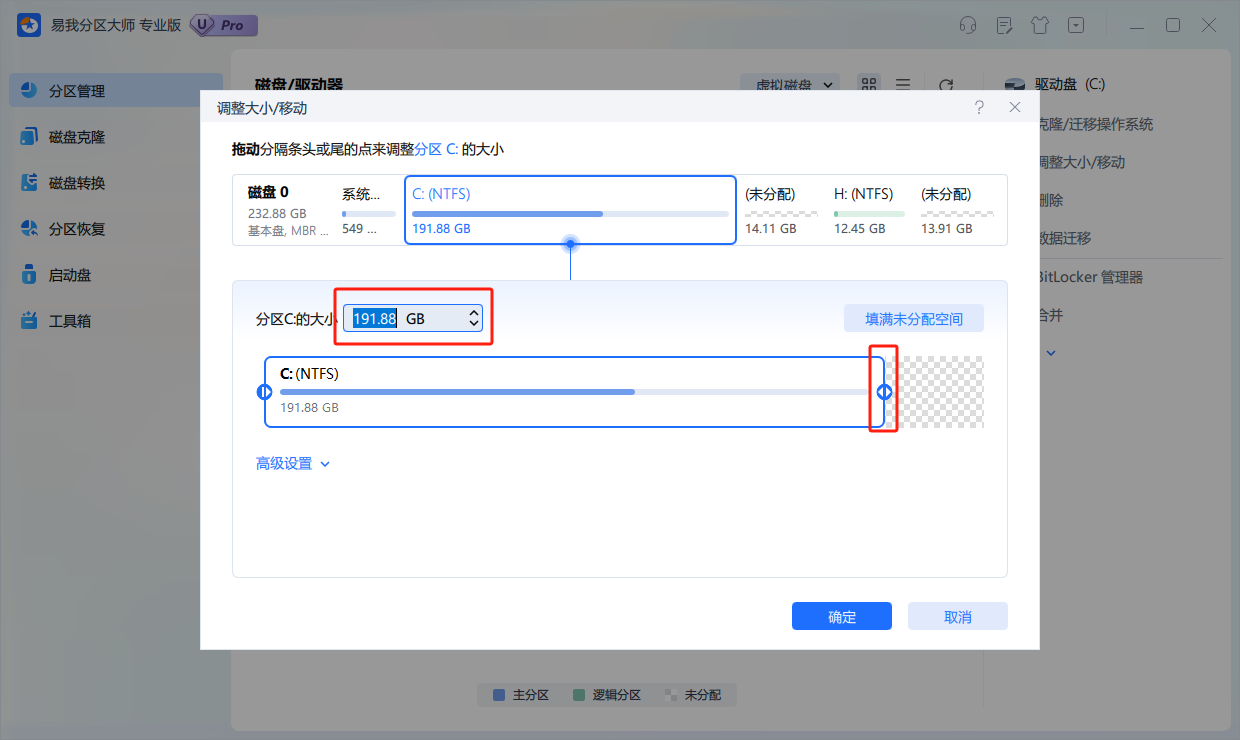 3.调整C盘大小:在新弹出的页面可以直接输入C盘分配的总空间,或者拖动按钮拉取要给C盘分配的空间。