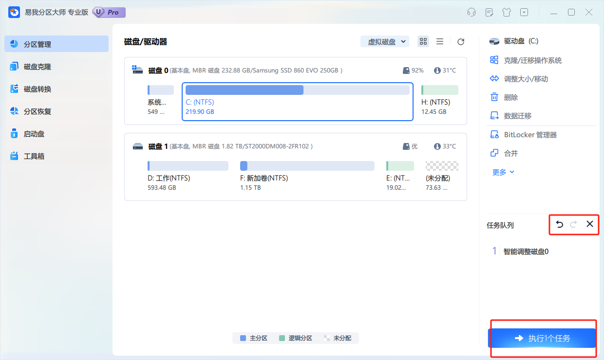 4.设置好后点击“确定”,并点击“执行1个任务”,可以在“任务队列”撤销上一步操作或者删除任务,随后点击“应用”。