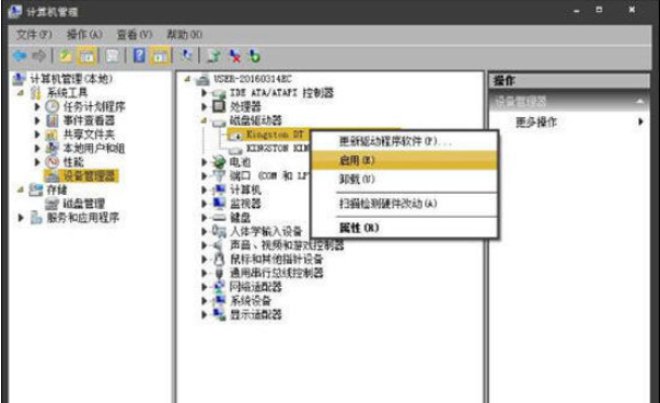 2、在计算机管理界面,依次展开“系统工具——设备管理器”,然后在窗口右侧USB设备中找到移动硬盘,右键点击选择“启用”