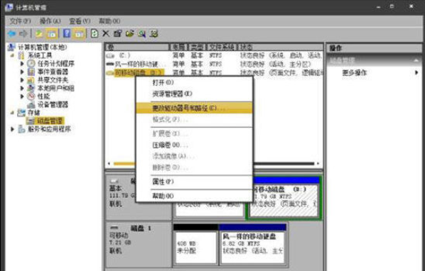 3、然后在磁盘管理中右键点击移动硬盘,选择“更 改驱动器号和路径”,最后为其选一个盘符即可