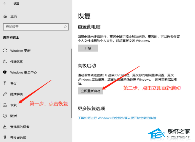 2. 选择“恢复”,点击“立即重新启动”。