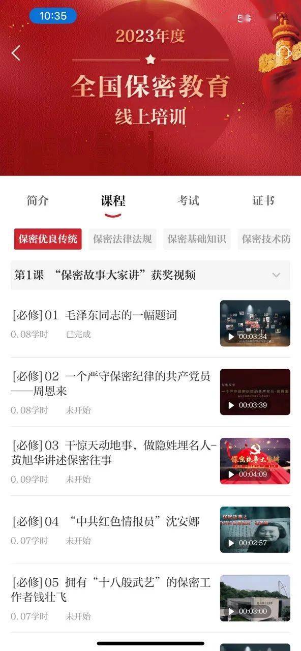 进入系统,点击"课程"开始学习。课程内容包含保密优良传统、保密法律法规、保密基础知识、保密技术防范和保密警示案例5部分,以视频、音频为主。其中, 标注"必修"字样的课程,是必须学习的内容。
