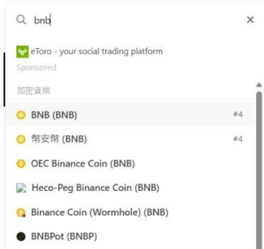 听到任何加密货币,先上CoinGecko 查就对了。假设有人说$BNB 是个有潜力的币,打开CoinGecko 网站,在右上方搜寻框中输入BNB,看看有没有出现对应的结果。