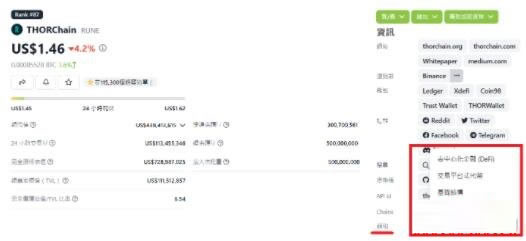 这也是先上CoinGecko 查找,假设是有收录的币,就可以点进去看详细资讯,评估是否真有潜力,也能在右方资讯这边找到这个加密货币的各种官方连结,官网与社群连结等等,务必从这边找到正确的官方连结,不要相信陌生网友提供的不明连结。