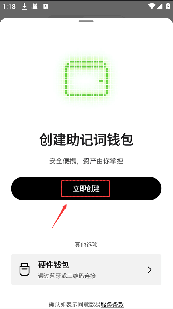 3、点击进入后,会看到"创建钱包"的选项。点击"创建钱包"