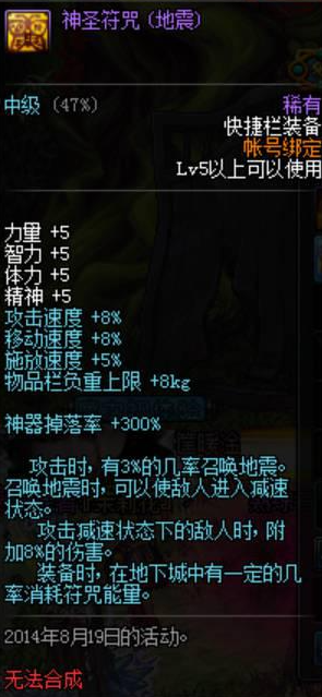 2014年8月左右,DNF有了快捷栏装备的概念,而第一批快捷栏装备就是这个神圣符咒系列,但万万没想到的是,这些免费的快捷栏装备直到现在,它们凭借着8%的白字伤害,屹立在所有快捷栏装备之巅,但由于其能量不能依靠修理补充,所以这个纹章大多都只是在打卢克的时候用用。