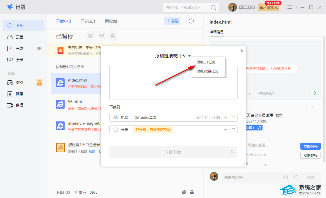 2、之后就会弹出一个新建的窗口,将【添加链接或口令】的下拉按钮点击打开,选择【添加bt任务】。