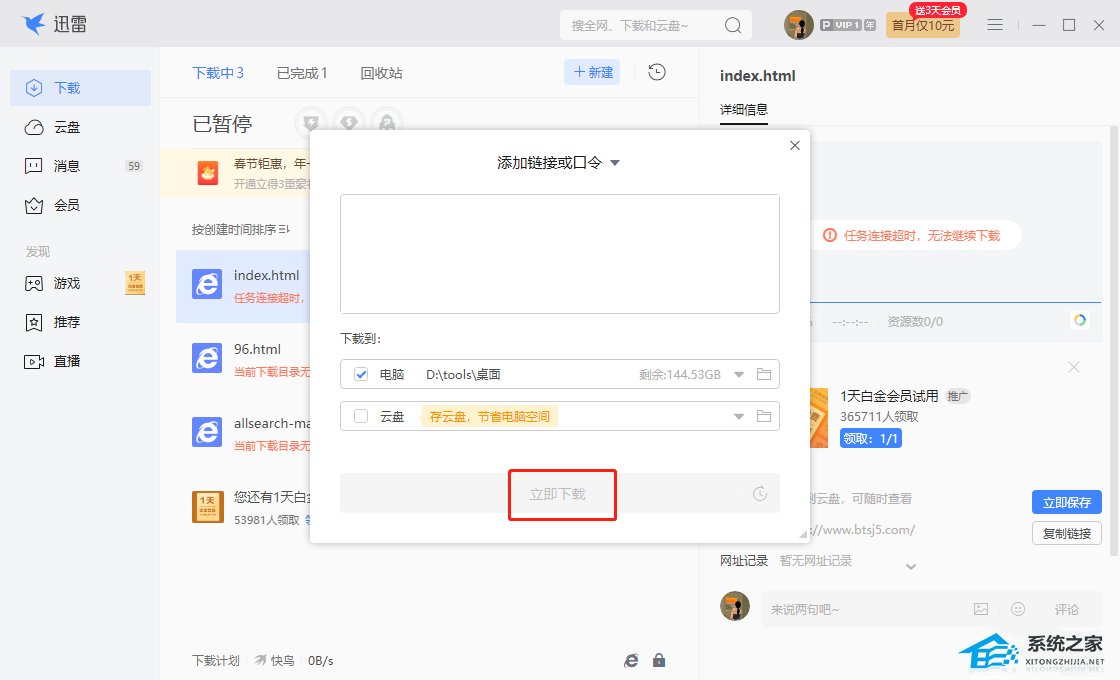 5、设置完成之后,再点击【立即下载】按钮就好了,一般下载bt文件的速度都比较慢,耐心等待一下就可以了。