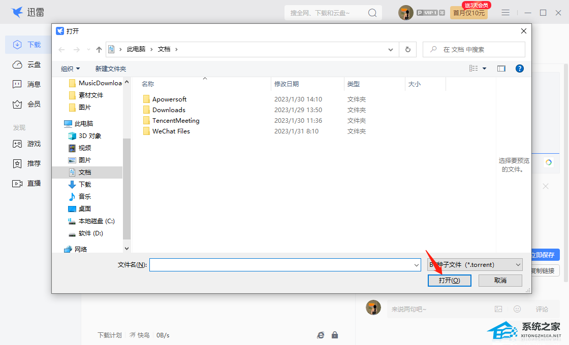 3、之后就会弹出一个本地文件夹的浏览页面,你需要在该页面中将自己保存的bt文件找到,然后将其选中再点击【打开】按钮进行添加,之后迅雷会自动识别bt种子文件,一般种子文件有包含其他的一些不需要的文件,将不需要的文件取消勾选即可。
