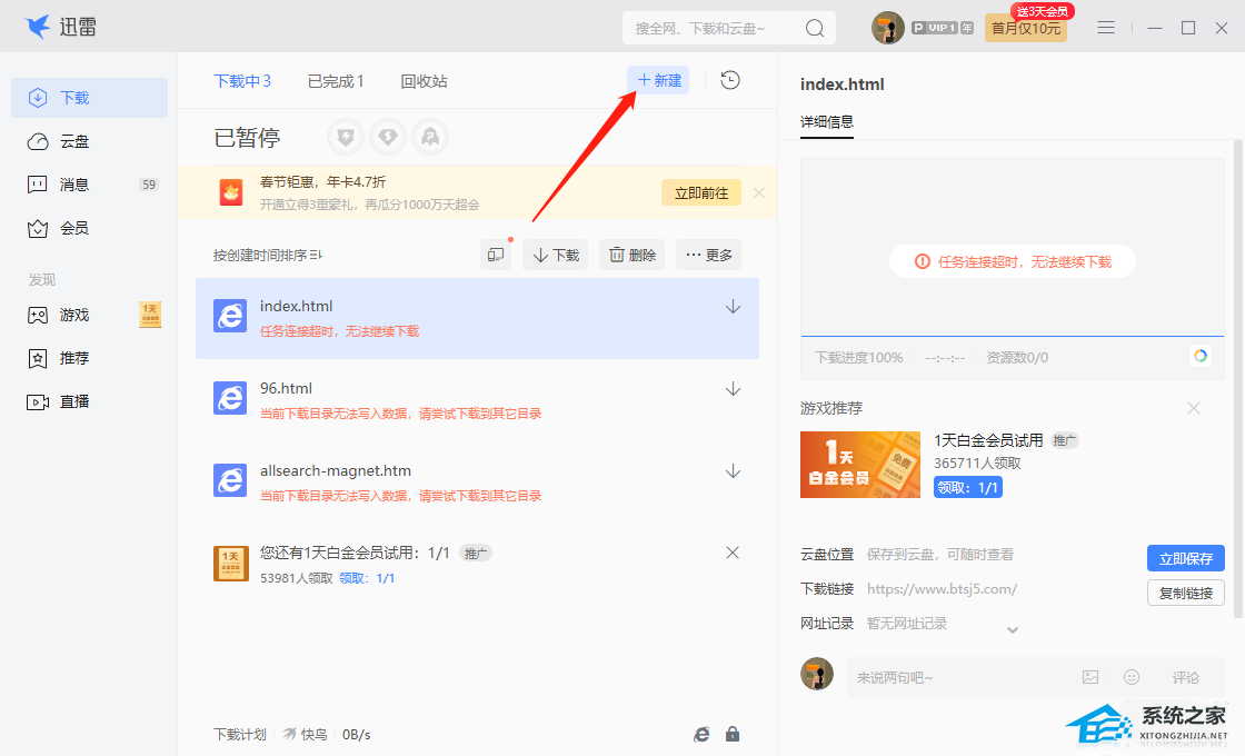 1、首先我们需要将迅雷电脑版点击打开,然后进入到主界面中将【新建】按钮点击一下。