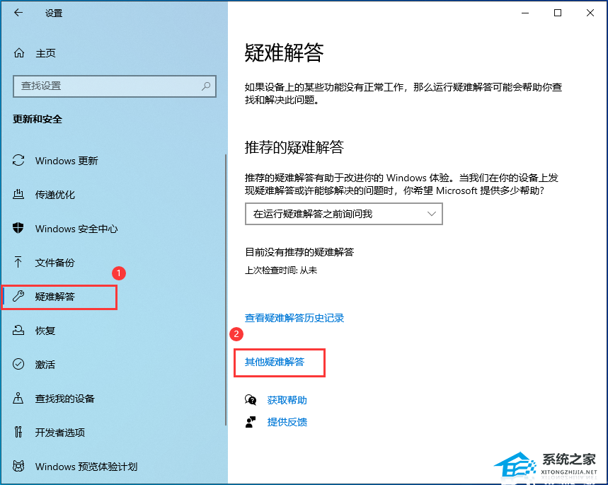 3. 更新和安全主页设置窗口,左侧点击【疑难解答】,右侧点击【其他疑难解答】;