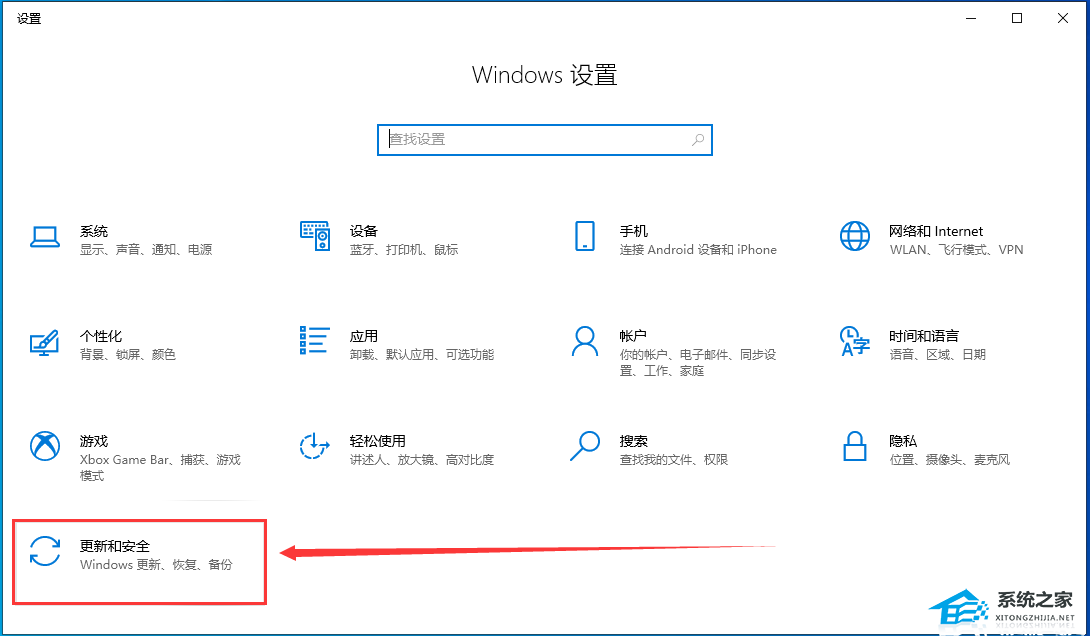 2. Windows 设置窗口,搜索框可以查找设置,也可以直接点击【更新和安全(Windows 更新、恢复、备份)】;