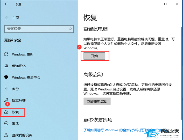 3. 更新和安全主页设置窗口,左侧边栏点击【恢复】,右侧点击恢复重置此电脑下的【开始】;
