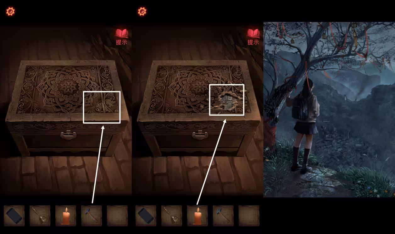 18、箱子里拿到【小孩衣物】,退出房间用【奘铃】打破幻象,拿到河灯里的【蜡烛】。