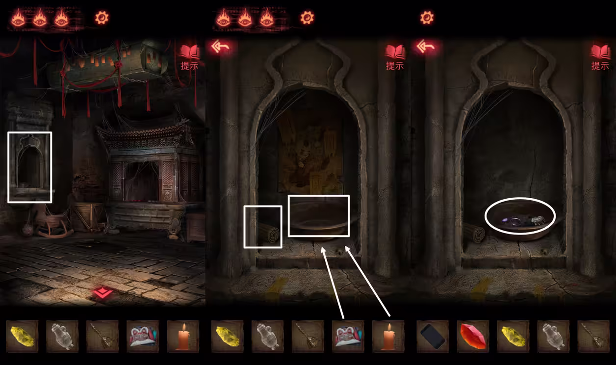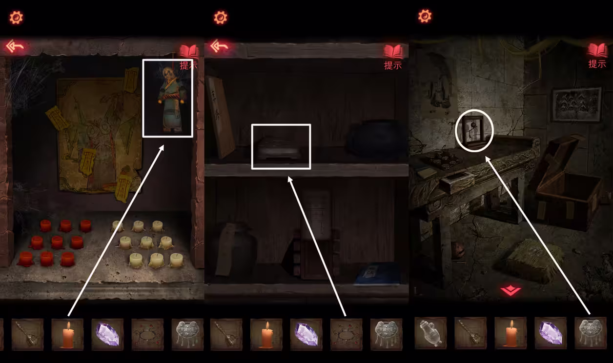 21、根据手镯和画像的提示,用【蜡烛】点燃对应位置的红白蜡烛。