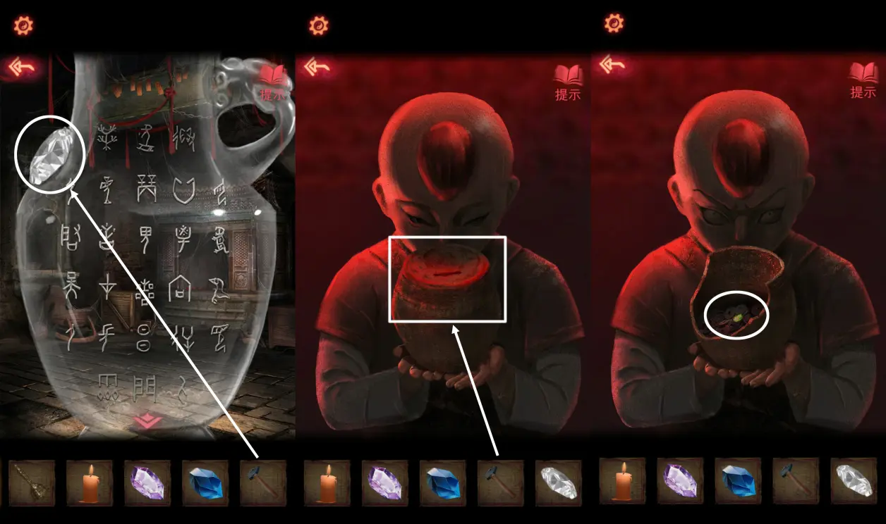 23、用【锤子】拿到【玻璃瓶】上的【六葬宝石】,用【锤子】砸破男童手上的存钱罐,拿到【六葬宝石】。