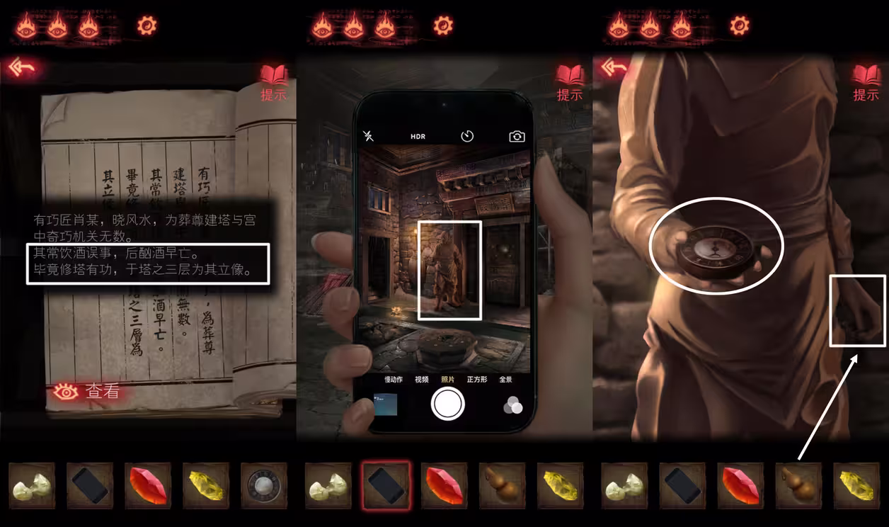 11、根据《葬塔》描述工匠好酒,将【铜葫芦】挂到工匠泥像的手上,拿到【罗盘】。