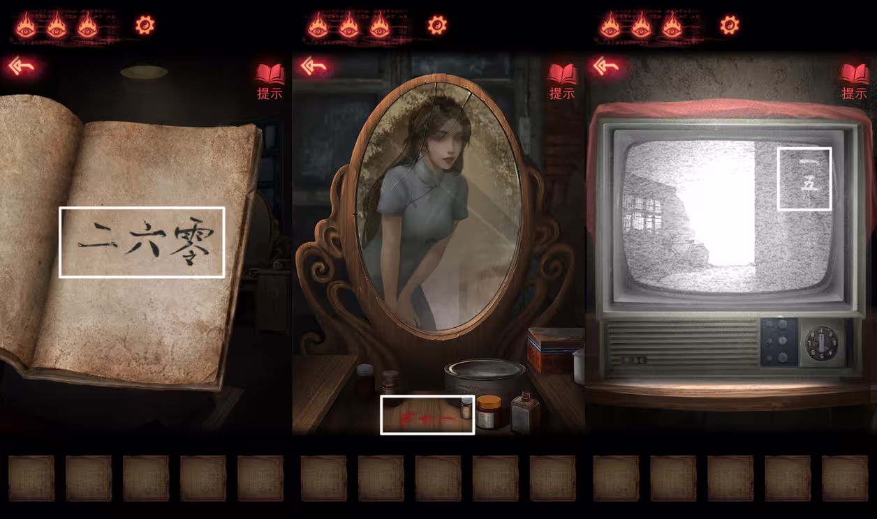 4、掀开镜子上的红布,过一段剧情。根据桌上的书、梳妆台、电视上的数字,打开贴有画的柜子的锁,拿到【玉石】。