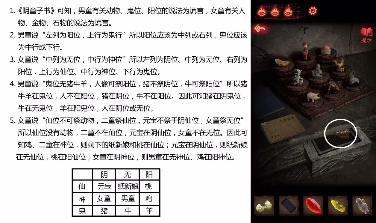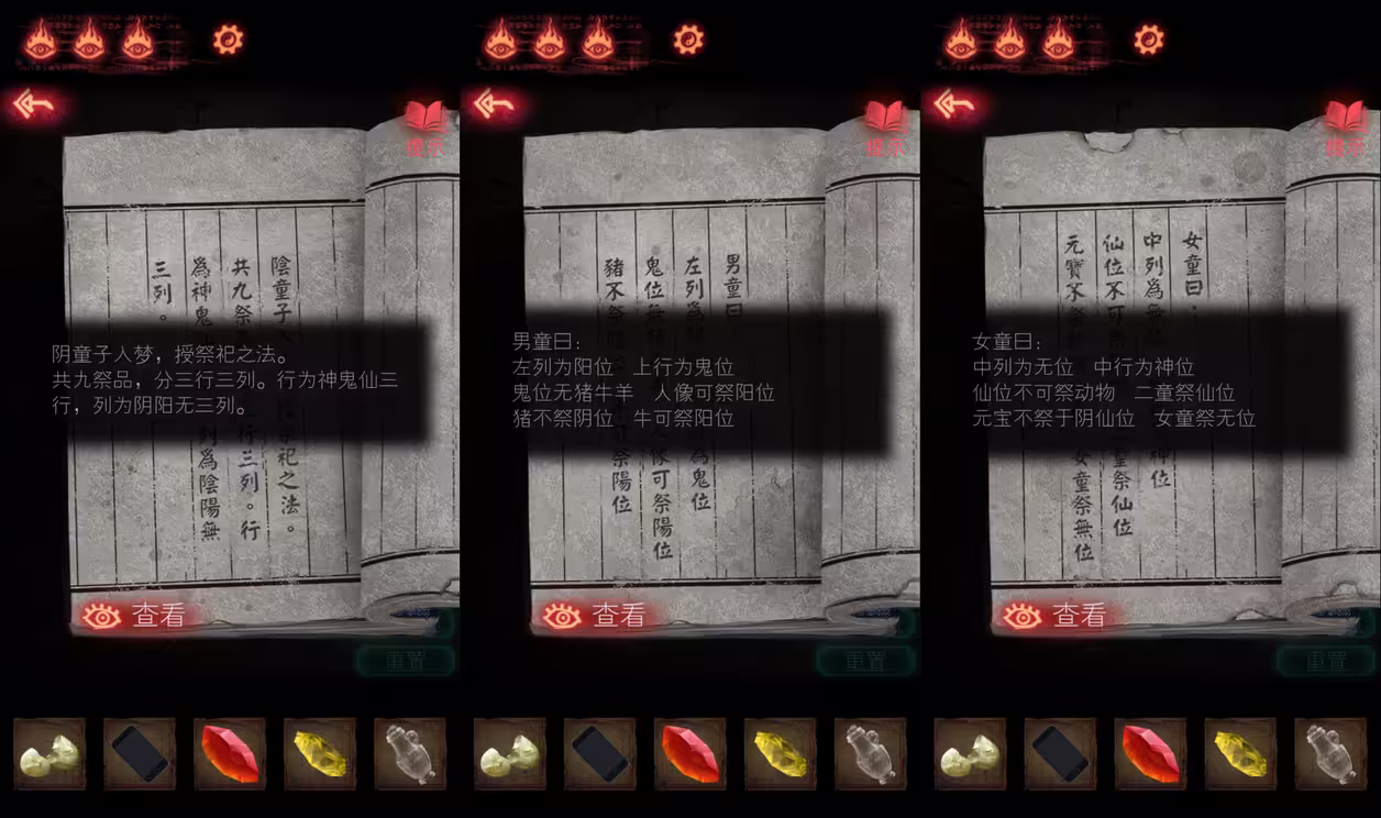 17、根据一层的《阴童子书》和桌上的《祀录》提示,摆好贡品的位置,拿到【奘铃】。