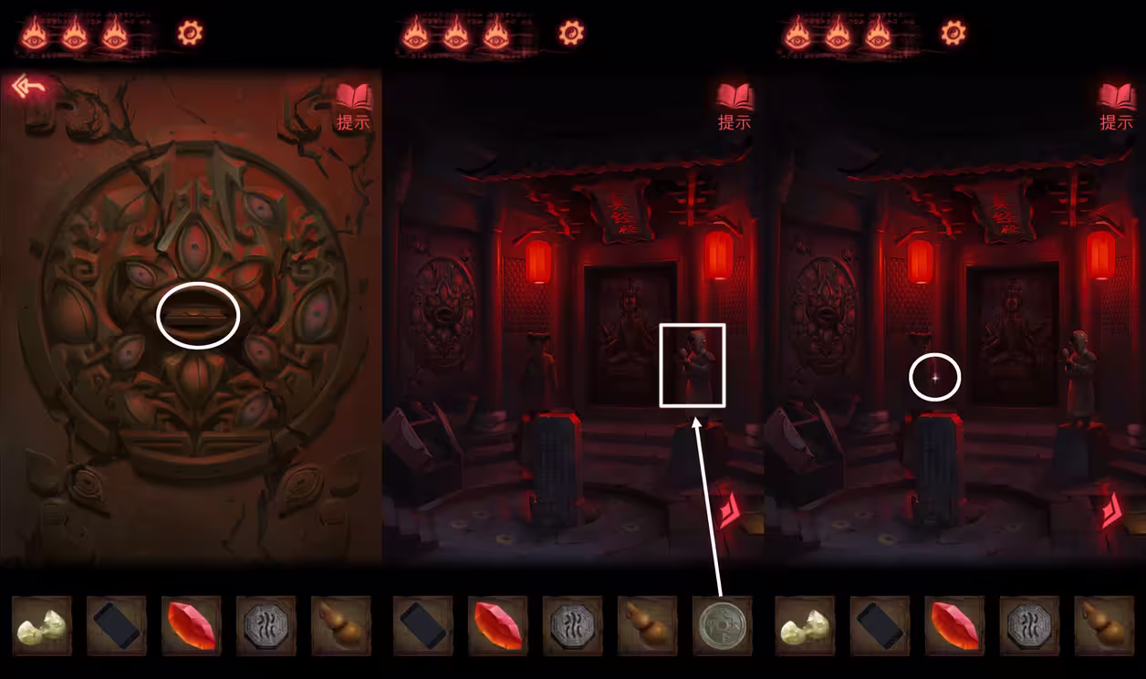7、根据书架上的《妙法》里的提示,解开一层的眼睛机关,拿到【风水铜钱】。