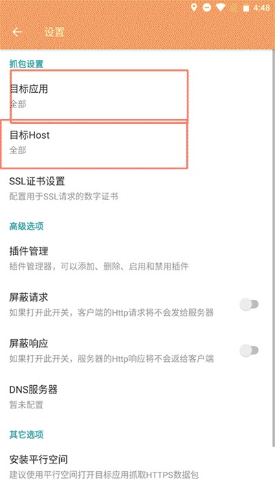 在Http Canary中点击设置- 目标应用 - 添加轻颜相机(为了不抓取其他多余的app的数据,方便找包)