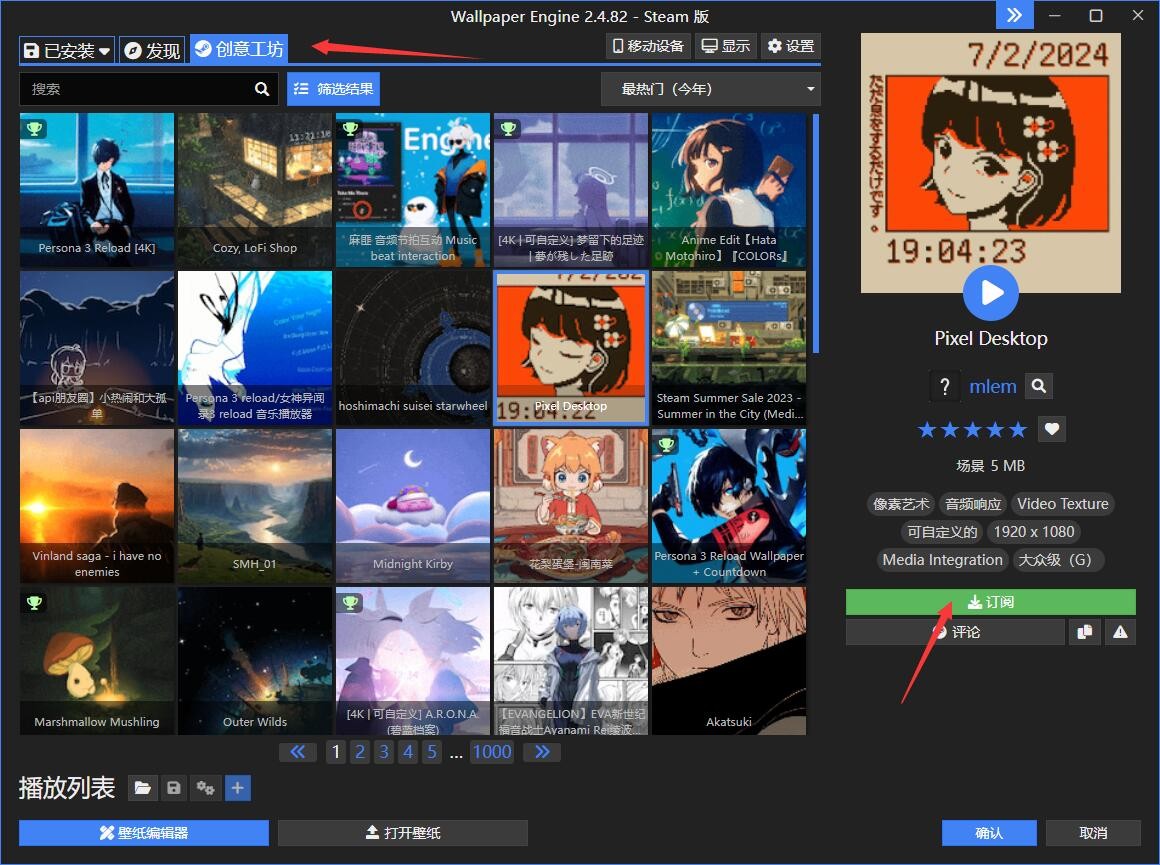 5、能够点击上边的创意工坊,随后选择你喜欢的壁纸,点击订阅,就可以设置新壁纸了。