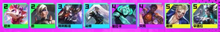 1、阵容构成:悠米、蔚、阿利斯塔、娑娜、索拉卡、艾克、迦娜、辛德拉、蕾欧娜