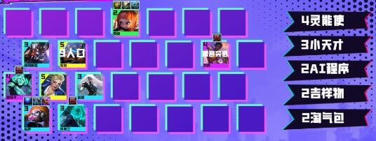 2、羁绊:4灵能+3小天才+2AI+2吉祥+2淘气包+2爱心使者+2福牛+2秘术+2黑客+1平民