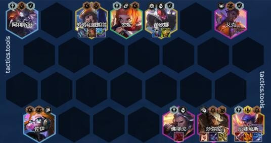1、阵容组成:安妮、佐伊、乐芙兰、阿利斯塔、娑娜、艾克、索拉卡、迪迦、努努