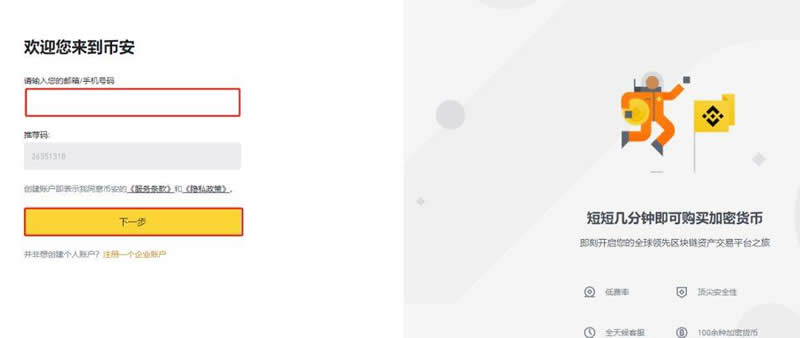 2、币安已全面开放大陆用户进行手机 号注册,输入手机 号、点击下一步即可。