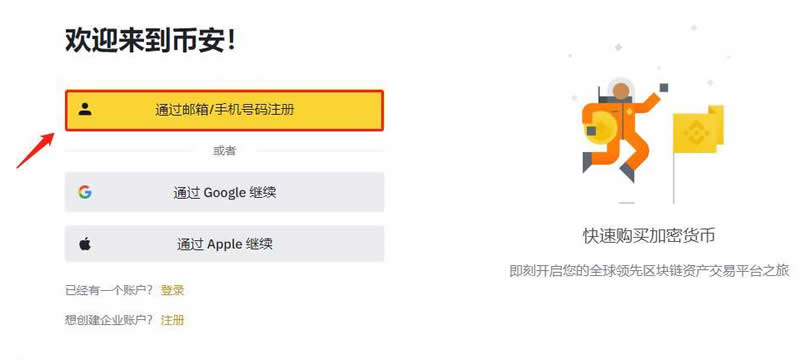 1、打开币安官网(点击注册),点击左侧的【使用手机 号邮箱注册】