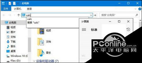 2、或者用户想要打开计算器,直接在资源管理器窗口中输入calc回车即可。
