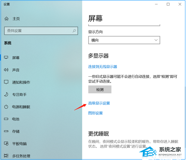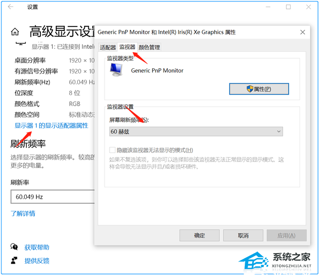 3、在高级显示设置里,选择显示器1的显示适配器属性,然后选择监视器,此时可以将屏幕刷新率调整到75HZ即可!如下图所示: