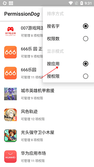 1、下载安装好权限狗app,打开应用点击右上角三条横线的图标,选择应用排序或者权限排序;