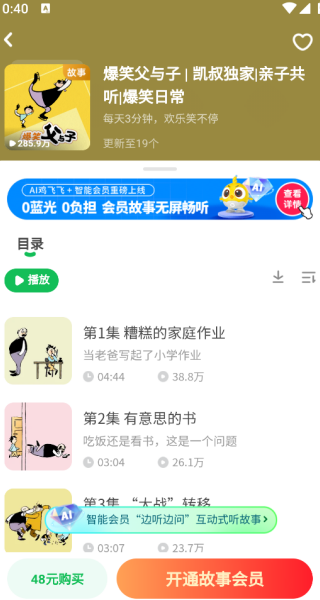 3、找到适合的故事,点击进入,可以选择集数,然后就能畅听了;