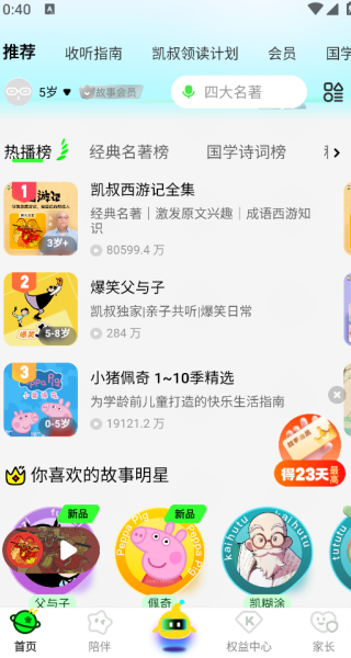 凯叔讲故事app是一款让孩子听故事的软件;这款软件中拥有海量的精品故事内容,中国历史典故、成语故事、民间传说、经典童话、西方神话等各种类型的故事应有尽有,让孩子通过听故事全方面的了解学习很多文化知识,帮助孩子快乐学习,提升各方面的思维方式,大大提高学习效率;软件系统还会根据孩子的学习兴趣智能推荐喜欢的故事,听故事还有趣味答题,不仅可以涨知识还有很多的Q萌勋章可以领取;赶紧点击下载这款凯叔讲故事app,通过听故事让孩子零距离接触文学经典,激发他们的想象力和好奇心。