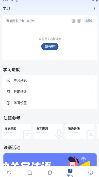 2、进入到学习栏目,我们还可以在这里选择课本,让您学习起来更为轻松,点击下方的法语题库进入。