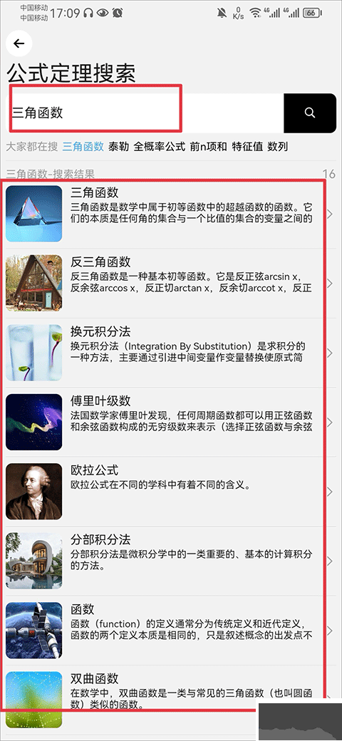 2、利用搜索功能,输入需查询的公式定理关键词,进行检索。
