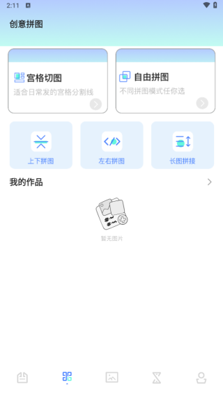 4、底部的创意批图板块,涵盖宫格切图、自由拼图、上下左右拼图、长图拼接等多种模式。