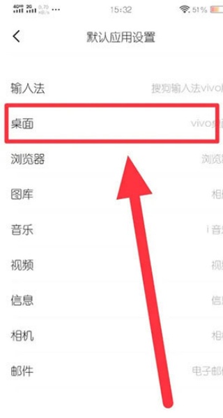 3、在默认应用设置里面,找到桌面,点击进入桌面设置界面;