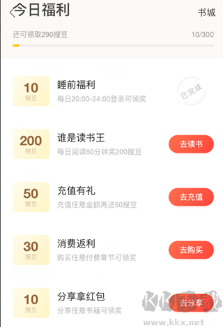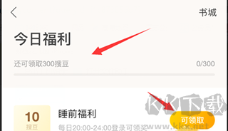 4、每天完成任务最多能拿300搜豆,晚上8点到12点登录还能额外领"睡前福利"10搜豆。