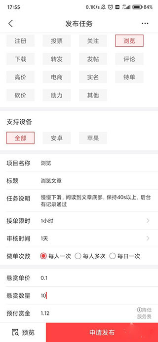 4、选择完类型和支持设备后,项目名称可以填浏览+平台(你发布的浏览的文章的所在平台名),项目名称将作为标题的标签,所以标题填浏览文章(包括了项目名称)接下来是任务说明,可以在这里写上注意事项和要求,比如要求阅读长,用什么来阅读,本例填(慢慢下滑,阅读到文章底部,保持40s以上,后台有记录通过等)