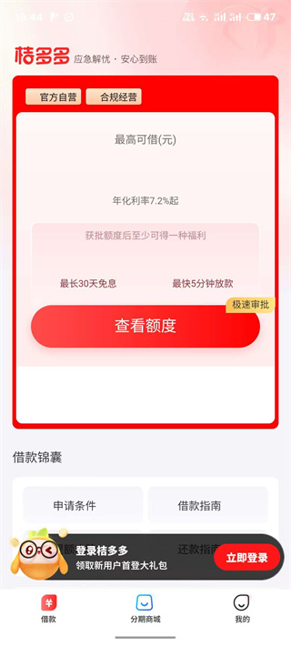 上文就是桔子分期的介绍了,本站下载资源均来源网络,不存储任何下载资源,如有侵犯您的权益或者资源有问题,请及时联系我们,更多桔子分期相关资讯及软件,请关注收藏西西软件站。1、打开该软件后就能进入主页,查看页面中展示的保障标签